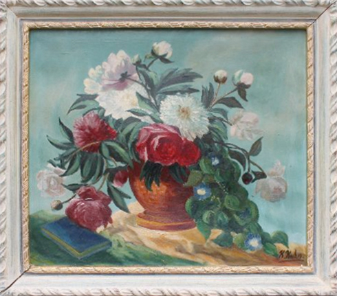 Pfingstrosen in Vase und Buch. Das Bild wurde Anfang 2026 im Stuttgarter Kunsthandel angeboten.