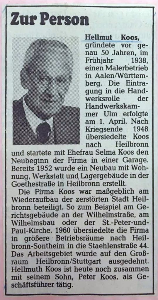 Sein Heilbronner Betrieb erhielt eine große Zahl öffentlicher Aufträge im Rahmen des Wiederaufbaus der im Krieg stark zerstörten Stadt. Koos erledigte Malerarbeiten am Gerichtsgebäude in der Heilbronner Wilhelmstraße, am benachbarten Wilhelmsbau oder an der St.-Peter-und-Pauls-Kirche im Heilbronner Deutschhof. Er führte ausserdem in zahlreichen sozialen Wohnungsbauprojekten Malerarbeiten aus. Sein anfangs in einer Garage „In der Gais“ befindlicher Betrieb zog 1954 in einen Neubau in der Goethestraße und 1960 in größere Betriebsräume in der Staehlenstraße 44 in Heilbronn-Sontheim. Neben der Ausführung von Maler-, Lackier- und Tapezierarbeiten bot das Unternehmen auch ausdrücklich die Erstellung von Reklametafeln und Ölgemälden an.