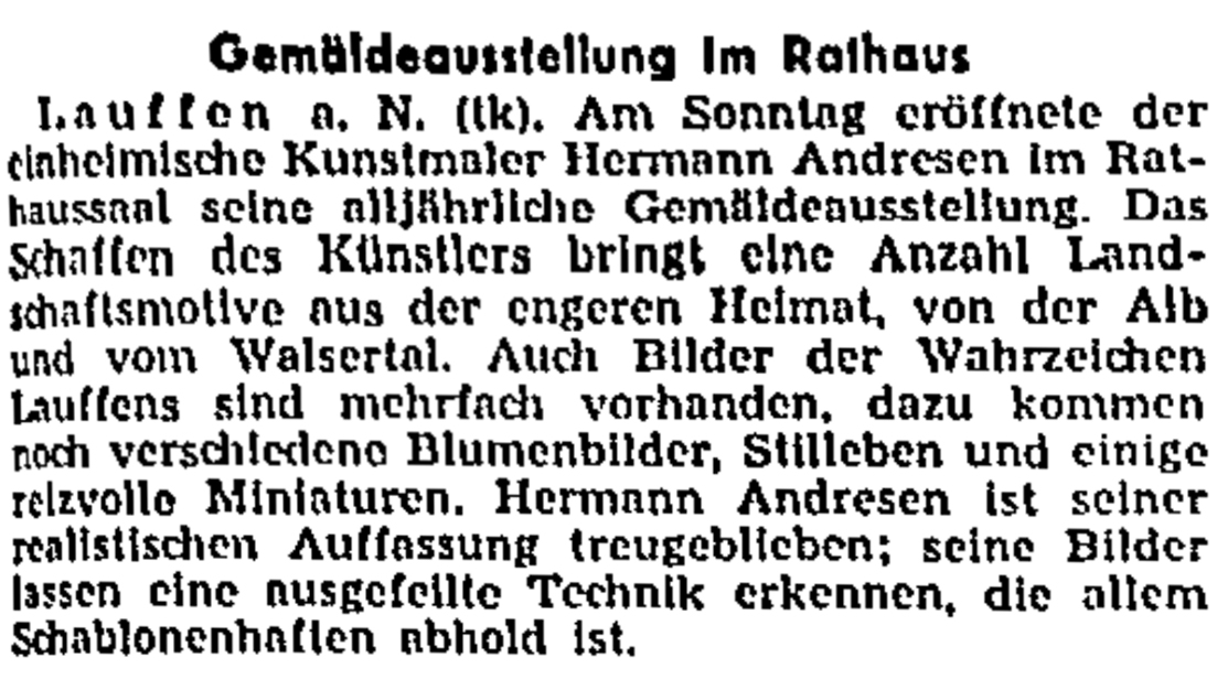 Hermann Andresen (1884-1966) stammte aus Husum, war ab 1907 in Heilbronn, wo er Zeichenunterricht bei Walther Eberbach nahm, und studierte ab 1909 in Stuttgart, wo er sich als Maler niederließ. Nach dem Zweiten Weltkrieg lebte und arbeitete er in Lauffen am Neckar.