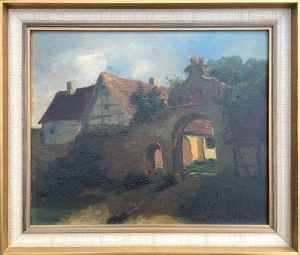 Ein uns zu Beginn des Jahres im Kunsthandel aufgefallenes hübsches Bild mit einem Gehöft hinter einem verschatteten Hofportal galt noch als unsigniert, als wir es gekauft haben. Das Bild hat sich jedoch bei Licht betrachtet als durchaus signiertes Werk der Stuttgarter Malerin Johanna Dann (1878-1974) entpuppt, die zu den bedeutenden Schwäbischen Impressionistinnen zählt. Zusätzlich hat die Malerin des qualitätvollen Bildes für uns auch regionale Bedeutung, da sie als Tochter eines Pfarrers im von uns kaum 5 km entfernten Fürfeld geboren wurde.