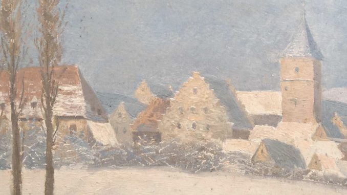 Im März 2025 befassten wir uns mit Recherchen zum Stuttgarter Maler Hermann Erlenbusch (1890-1978), von dem wir bereits seit längerer Zeit ein Bild mit der Darstellung einer Dorfkirche besitzen. Wir haben uns vor allem auf Erlenbuschs künstlerischen Werdegang in den 1920er und 1930er Jahren konzentriert und fanden erstaunliche Zusammenhänge. So war er zwar 1929 an der Ausführung von später als „entartet“ geltenden Fresken im Klagenfurter Landtagsgebäude beteiligt, malte dann aber später ganz im Sinne der NS-Kulturpolitik u.a. ein Hitler-Porträt oder ein Selbstbildnis in SA-Uniform.